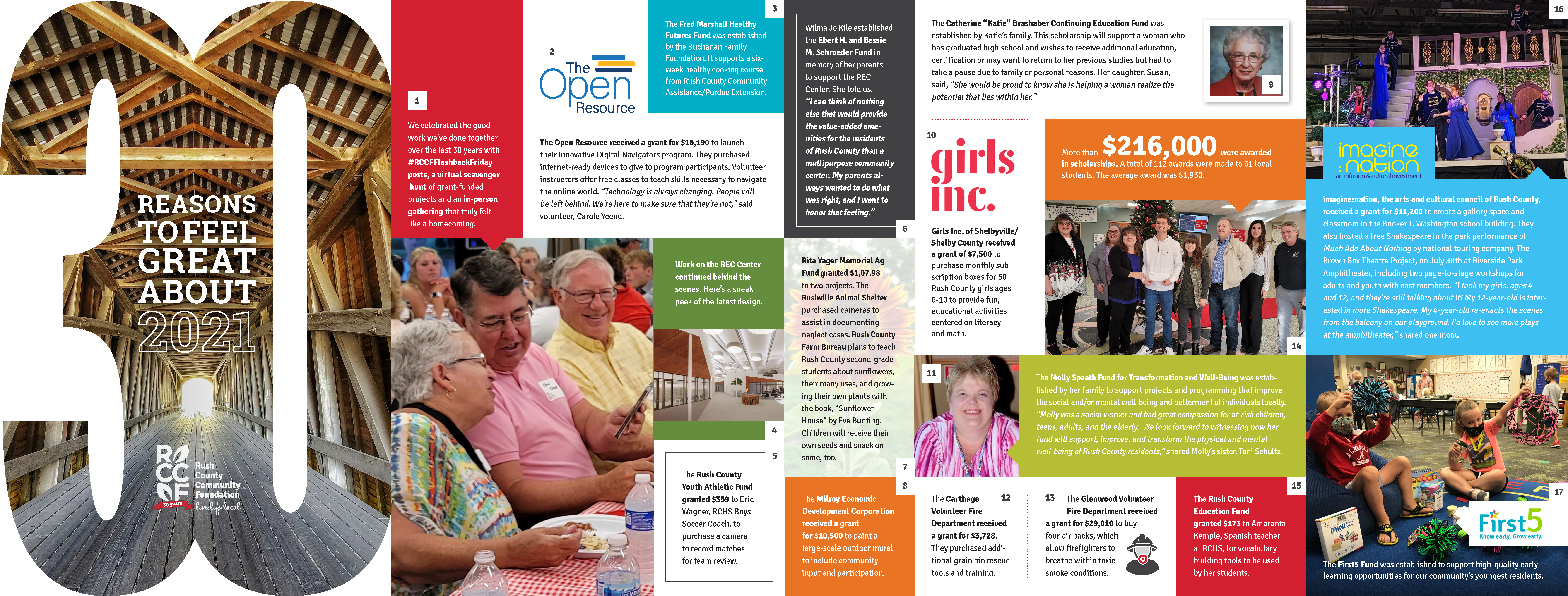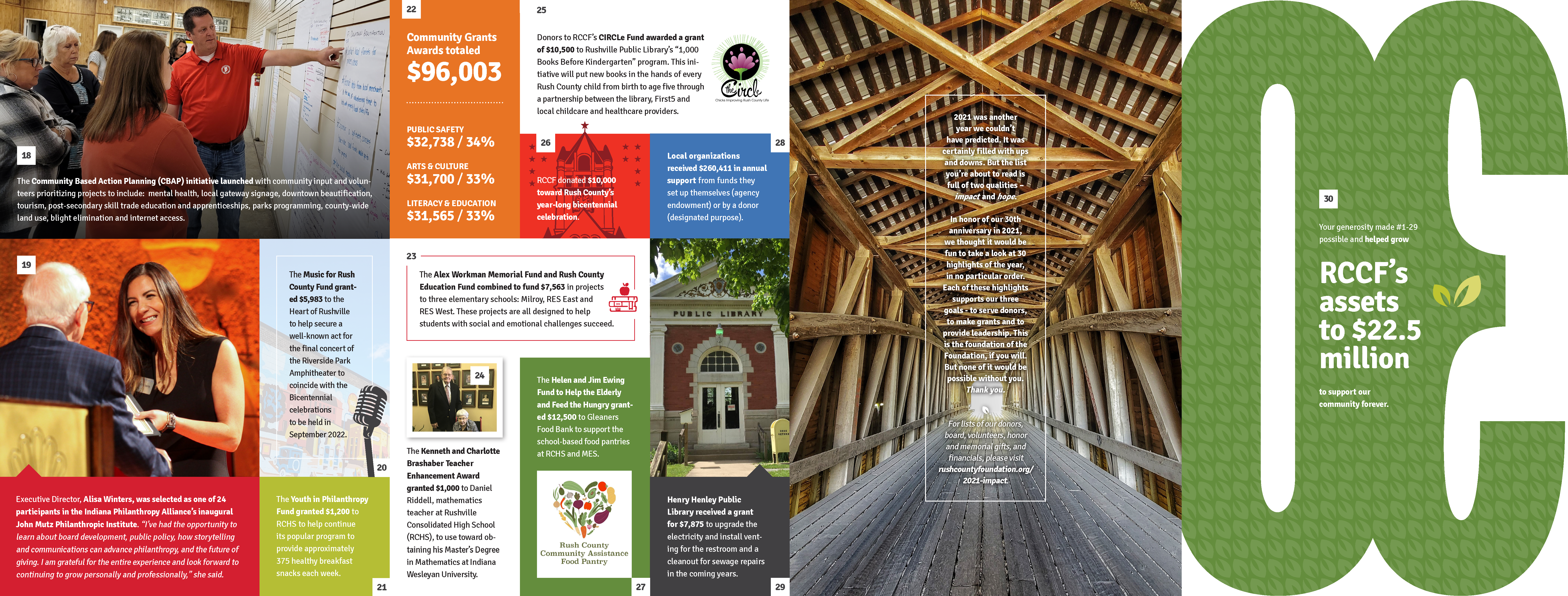 2021 Annual Impact Report 2021 was another year we couldn’t have predicted. It was certainly filled with ups and downs. But your annual report is full of two qualities – impact and hope. Each of these 30 highlights, in honor or our 30th anniversary, supports our three goals – to serve donors, to make grants and to provide leadership. This is the foundation of the Foundation, if you will. But none of it would be possible without you. Thank you. If you didn’t receive a hard copy and would like one, please contact Lisa at lbenjamin@hopeful-franklin.159-203-167-124.plesk.page or (765)938-1177, ext.4. You can also download it here for a closer look. 2021READ MORELEGACY GIVINGMORE Look at all the good things that 2021 brought. To view full stories, click on the READ MORE tab to find a list of links and see just how much we were able to accomplish together. We celebrated the good work we’ve done together over the last 30 years with #RCCFFlashbackFriday posts, a virtual scavenger hunt of grant-funded projects and an in-person gathering that truly felt like a homecoming. The Open Resource received a grant for $16,190 to launch their innovative Digital Navigators program. Fred Marshall Healthy Futures Fund supports a six-week healthy cooking course. Work on the REC Center continued behind the scenes. The Rush County Youth Athletic Fund granted $359.19 to Eric Wagner, Boys Soccer Coach at RCHS, to assist with the purchase of a Veo camera system. He can record soccer matches for team review and livestream matches. Wilma Jo Kile established the Ebert H. and Bessie M. Schroeder Fund in memory of her parents to support the REC Center. The Rita Yager Memorial Ag Fund granted $1,007.98 to two projects. The Rushville Animal Shelter purchased a camcorder and camera to assist in documenting any future animal neglect cases. Rush County Farm Bureau will use their award to teach all Rush County 2nd grade students growing sunflowers and their many uses. The Milroy Economic Development Corporation received a grant for $10,500 to paint a large-scale outdoor mural to include community input and participation. The Catherine “Katie” Brashaber Continuing Education Fund was established by Katie’s family in her memory. Girls Inc. of Shelbyville/Shelby County received a grant of $7,500 to provide monthly subscription boxes for 50 Rush County girls ages 6 – 10 to provide fun, educational activities centered on literacy and math. The Molly Spaeth Fund for Transformation and Well-Being was established by her family to support projects and programming that improve the social and/or mental well-being and betterment of individuals locally. The Carthage Volunteer Fire Department received a grant for $3,727.95 to purchase additional grain bin rescue tools and training. The Glenwood Volunteer Fire Department received a grant for $29,009.88 to buy four air packs, which allow firefighters to breathe while in toxic smoke conditions. More than $216,000 were awarded in scholarships. A total of 112 awards were made to 61 local students. The average award was $1,930.31. The Rush County Education Fund granted $172.73 to Amaranta Kemple, Spanish teacher at RCHS, for vocabulary building tools to be used by her students. imagine:nation, the arts and cultural council of Rush County, received a grant for $11,200 to create a gallery space and classroom in the Booker T. Washington school building. They also hosted a free Shakespeare in the park performance of Much Ado About Nothing by national touring company in July at Riverside Park, including two page-to-stage workshops for adults and youth with cast members. The First5 Fund was established to support high-quality early learning opportunities for our community’s youngest residents. The Community Based Action Planning (CBAP) initiative launched. Informed with community input, volunteers prioritized projects to include: mental health, local gateway signage, downtown beautification, tourism, post-secondary skill trade education and apprenticeships, parks programming, county-wide land use, blight elimination and internet access. The Rush to Help Action Fund will support these activities with more than $38,000 in your donations and matching dollars. Executive Director, Alisa Winters, was selected as one of 24 participants in the Indiana Philanthropy Alliance’s inaugural John Mutz Philanthropic Institute. The Music for Rush County Fund granted $5,982.74 to the Heart of Rushville to help secure a well-known act for the final concert of the Riverside Park Amphitheater to coincide with the Bicentennial celebration to be held in September of 2022. The Youth in Philanthropy Fund granted $1,200 to RCHS to help continue its popular program to provide approximately 375 healthy breakfast snacks each week. Community Grants Awards totaled $96,002.83. The funding breakdown illustrates a balanced mix of interests – Public safety: $32,737.83, 34% | Arts & culture: $31,700, 33% | Literacy & education: $31,565, 33% The Alex Workman Memorial Fund and Rush County Education Fund combined to fund $7,563 in projects to three elementary schools: Milroy, RES East and RES West. These projects are all designed to help students with social and emotional challenges succeed. Kenneth and Charlotte Brashaber Teacher Enhancement Award granted $1,000 to Daniel Riddell, mathematics teacher at Rushville Consolidated High School (RCHS), to use toward obtaining his Master’s Degree in Mathematics at Indiana Wesleyan University. Donors to RCCF’s CIRCLe Fund awarded a grant of $10,500 to Rushville Public Library’s “1,000 Books Before Kindergarten” program. RCCF donated $10,000 toward Rush County’s year-long bicentennial celebration. The Helen and Jim Ewing Fund to Help the Elderly and Feed the Hungry granted $12,500 to Gleaners Food Bank to support the two school-based food pantries in Rush County, housed at RCHS and MES. Local organizations received a total of $260,411 in annual support from funds 