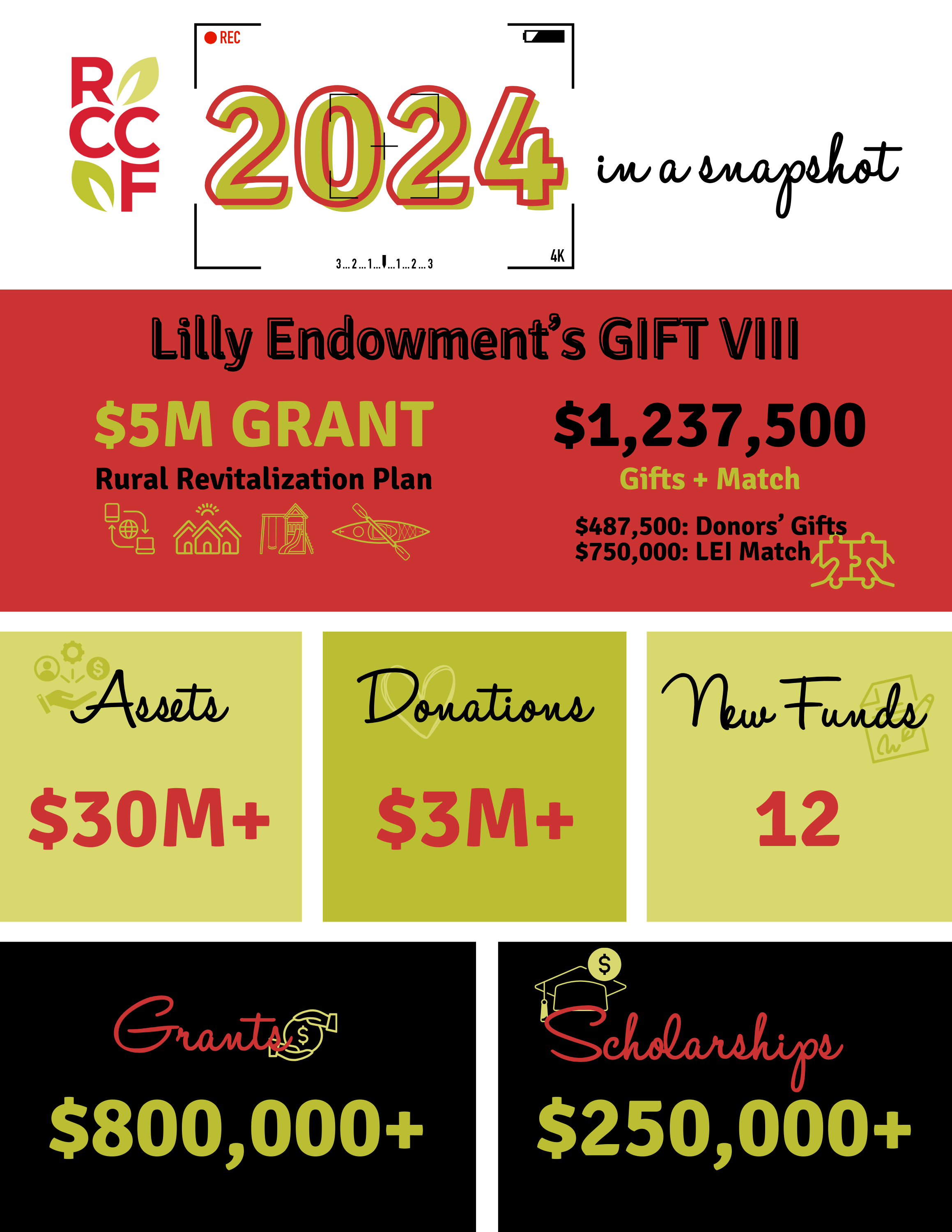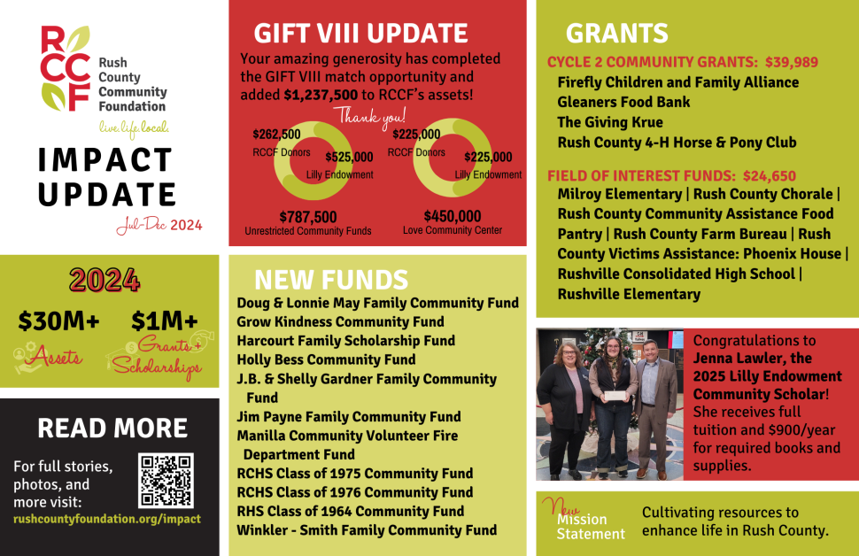 2024 Impact Update: Postcard #2 19th February 2025 Download a pdf of the postcard. We are thrilled to share with you that we’ve received a new $5M grant from Lilly Endowment through their GIFT VIII initiative! By the time you’re reading this, work will have already begun on the Rush County Rural Revitalization plan. What does this mean? We’re glad you asked. It will enhance life and improve opportunities in our small towns and unincorporated areas by: Expanding broadband access into the County by laying 45 miles of fiber infrastructure in tandem with other projects Purchasing and demolishing blighted properties to allow for new infill housing and offering owner-occupied rehabilitation grants Enhancing recreational opportunities through parks, playgrounds, and river access points This funding has the potential to change the trajectory of Rush County. Please join us in thanking Lilly Endowment for their continued investment in our future! READ MORE GIFT VIII UPDATE Your amazing generosity has completed the GIFT VIII match opportunity and added $1,237,500 to RCCF’s assets! Thank you! READ MORE GRANTS The latest cycle of Community Grants awarded $39,989 in grants this fall, thanks to your generosity. Read more about these awards and why they matter to our community. 2024 CYCLE II: $39,989 $10,000: Firefly Children & Family Alliance purchased diapers for First5’s From the Bottom Up Diaper Pantry and are offering Safe Sleep classes and car seat education to approximately 60 families. $15,000: Gleaners Food Bank stocked school-based pantries at Milroy Elementary and RCHS for students and their families with 145,000 pounds of food. $5,000: The Giving Krue received operating support to carry out their mission of distributing no longer need, donated items to those who can use them. $7,988.75: Rush County 4-H Horse and Pony Club added a set of bleachers to their arena. 2024 FIELD OF INTEREST FUND GRANTS: $24,650 When RCCF donors care about a certain cause or area of life, they might choose to start a field of interest fund to support it. Our 18 field of interest funds cover a diverse range of topics – from autism to food insecurity, and music to youth philanthropy. These funds offer specialized streams of support to nonprofits and schools and unique opportunities for donors like you to give to specific causes that are close to your heart. ALEX WORKMAN MEMORIAL FUND: $954.51 $681.77: Rushville Elementary purchased toys support students on the Autism Spectrum. $272.74: RCHS Life Skills Class purchased musical instruments and supplies to support students with severe to moderate mental and physical disabilities. BOB PRIDDY SPORTS PARTNER FUND: $240 Three youth received assistance with football camp registration fees. HELEN AND JIM EWING FUND: $10,000 Rush County Community Assistance Food Pantry purchased fresh and shelf-stable milk for their clients. MOLLY SPAETH FUND FOR TRANSFORMATION AND WELL-BEING: $2,005.77 Rush County Victims Assistance: Phoenix House purchased “fuel only” gift cards for clients and supplies for the shelter. This is the first grant awarded from this fund. MUSIC FOR RUSH COUNTY FUND: $2,479.72 $1,729.72: Rush County Chorale received operating support. $750: Rushville Elementary purchased instruments, sheet music, and recording supplies. RITA YAGER MEMORIAL AG FUND: $1,830 $1,500: Rush County Community Assistance Food Pantry purchased supplies for the Food is Medicine Program, healthy cooking classes they will offer at the Love Community Center. $330: Rush County Farm Bureau purchased copies of the Dr. Seuss book Mr. Brown Can Moo, Can You? for all Rush County first graders. ROBERT & GLEELA BALDSIN FUND FOR EARLY LEARNING: $2,500 The families of 3 Rush County students received a total of $2,500 to help offset the cost of attending a Paths to Quality Level 3 or 4 preschool. RUSH COUNTY EDUCATION FUND: $4,640 $750: Milroy Elementary purchased new physical education equipment. $820: RCHS Color Guard purchased additional flags and poles. $1,622.50: RCHS dual credit course, “Principles of Digital Design” purchased additional cameras. $1,447.50: RCHS’ yearbook, The Holcad purchased additional cameras. NEW FUNDS Our donors are known for their generosity. Since September, eleven new funds have been created to support the community in various ways. Donors for each of the new community funds took advantage of the match to triple their impact. We’re touched by the stories and grateful for the generous hearts of our donors! Doug and Lonnie May Family Community Fund: Started by the May Family. Grow Kindness Community Fund: Started by anonymous donors. Harcourt Family Scholarship Fund: Started by Carl and Barbara Harcourt, honoring Russell and Betty B. Harcourt, Marilyn Hardwick Woods, Maurita Ball, Betty Spyrison and Sharalie Harcourt, this fund provides a scholarship to residents of Orange or Anderson Township in Rush County for any schooling beyond high school. Holly Bess Community Fund: Started in memory of Holly by her husband, Brian, and their family. J.B. and Shelly Gardner Family Community Fund: Started by J.B. and Shelly Gardner to support the ever-changing needs and interests of the Rush County community with an unrestricted community fund. Jim Payne Family Community Fund: Bryan and Deb Garlock started this unrestricted fund in honor of Deb’s dad, Jim, for his 90th birthday. Manilla Community Volunteer Fire Department Fund: This fund was started by an anonymous donor to provide annual support to the Manilla Community Volunteer Fire Department. RCHS Class of 1975 Community Fund: Started by anonymous donors to honor the graduating class of 1975 with an unrestricted fund. RCHS Class of 1976 Community Fund: Started by anonymous donors to honor the graduating class of 1976. RHS Class of 1964 Community Fund: Anita Mohr and Chris Levi, alongside numerous classmates, started this unrestricted fund in honor of their graduating class. Winkler – Smith Family Community 