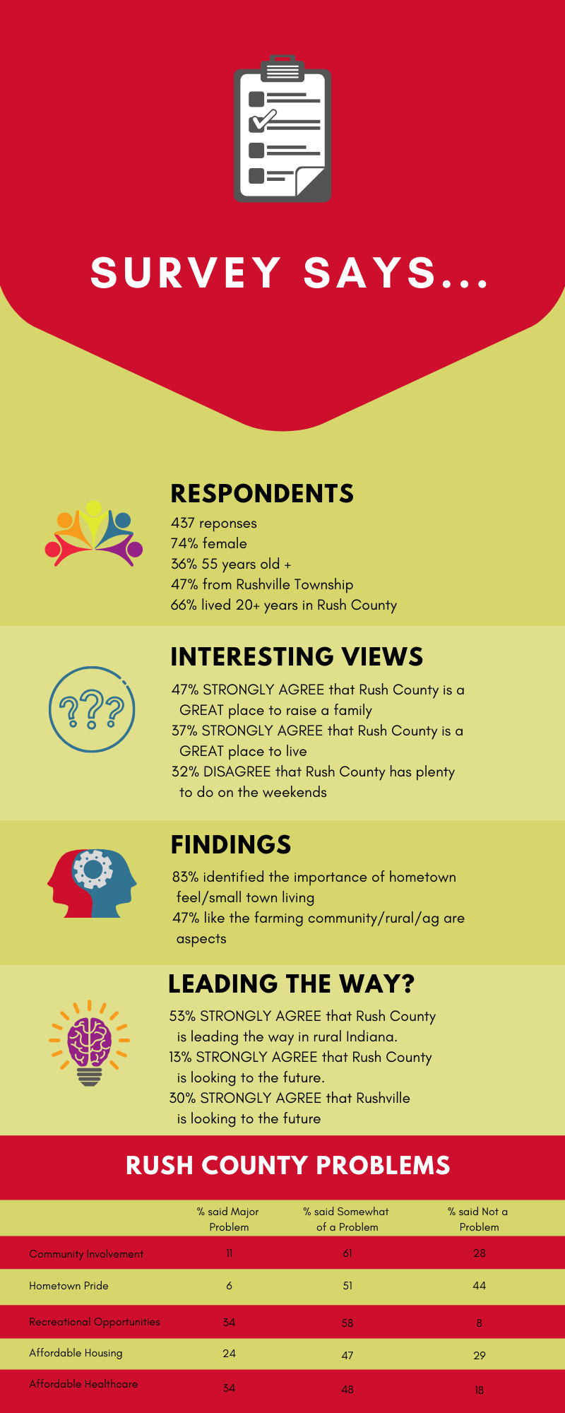 Rush County’s Readiness for Change Part 3: Survey Says… 13th March 2020 In effort to get more input and insight about our community, we shared a survey online. The respondents alone told us a lot. Females and long-time residents were well-represented. Guys, we need you to step it up! Other voices missing from the conversation were young people and newcomers to our community. We know these groups have a lot to add. Here’s what you had to say: Some of the findings were interesting and even seemingly contradictory. Upon further thought, they made sense. While 47% STRONGLY AGREE that Rush County is a GREAT place to raise a family, only 37% STRONGLY AGREE that it’s a GREAT place to live. Looking back at part 2 of this series the part 2 of this series, the Community Insights Recap, the answers begin to come into focus. This speaks to our collective feelings about loving our ag/rural lifestyle, small towns and the people – friends and family. These are all great reasons to raise a family here. But it also takes into account what we would LIKE TO LOVE – more and improved parks and trails, blight/beautification efforts, a community center, better housing options and broadband internet access. These are all amenities that make us love where we live. These thoughts should guide our community into the future. An excellent way to increase the quality of life for our current residents and those considering moving to Rush County is to focus on developing amenities. Community input is essential, as is ensuring all voices are being heard. How do we move forward? We’ll explore that in the fourth and final part of this series.