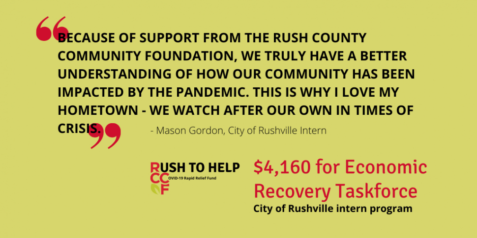 Rapid Relief Grant Awarded to Aid Rush County Economic Recovery Taskforce 30th April 2020 Your gifts are working hard again to help our community win the fight against this pandemic. The third Rush to Help: COVID-19 Rapid Relief Fund grant from the Rush County Community Foundation (RCCF) has been awarded to the City of Rushville to support the county-wide Economic Recovery Taskforce efforts. The money, $4,160, is being used to expand the City’s intern program, allowing the interns to begin working immediately, instead of starting in June. One full-time and three part-time interns will help build a database of the 500+ businesses in the county. Along with other local leaders, they are calling local businesses to record all contact information, document the changes each has faced since March 1 and share resources about assistance programs. A communication plan will be developed specifically for businesses. “We are so thrilled to have the opportunity to work side-by-side with local youth to gather critical information in a timely manner for our Rush County Economic Recovery Taskforce. Utilizing individual phone conversations, we have gathered employment figures, personal stories of how COVID-19 has impacted each industry in the county, and built key contact information to ensure we are prepared to communicate quickly to businesses now and in the future,” said Brian Sheehan, Director of Special Projects for the City of Rushville. This comprehensive list will be the first of its kind in our community. With the information gathered, the Economic Recovery Taskforce can make assessments about workforce issues and other gaps. It will provide a means to better support businesses through the recovery of the pandemic and into the future. Mason Gordon, one of the newly hired interns, added, “Because of support from the Rush County Community Foundation, we truly have a better understanding of how our community has been impacted by the pandemic. This is why I love my hometown – we watch after our own in times of crisis.” The people and businesses of Rush County are strong because we work together. Your gifts continue to provide support needed to transform recovery into victory. In this case, they will help the doors reopen and remain open for businesses throughout the county. Previous awards from the fund have supported the Rush County Community Assistance Food Pantry and the Milroy Community Food Pantry to ensure food security for all. There is a long road ahead of us, but we know we’ll make it. No amount is too small; the gifts all add up! And the CARES Act (Coronavirus Aid, Relief and Economic Security) has made has made it even more beneficial to donors. A new “above the line” charitable deduction of up to $300. For 2020, the income limit for cash contributions to charity rises to 100% of AGI (from the current 60% AGI limit). The repeal of required minimum distributions (RMD) for 2020. The tax filing deadline has been moved to July 15, 2020.onors by allowing for: You can support the Rush to Help: COVID-19 Rapid Relief Fund by by donating below, or mailing a check to RCCF, 117 N. Main Street, Rushville, IN 46173.