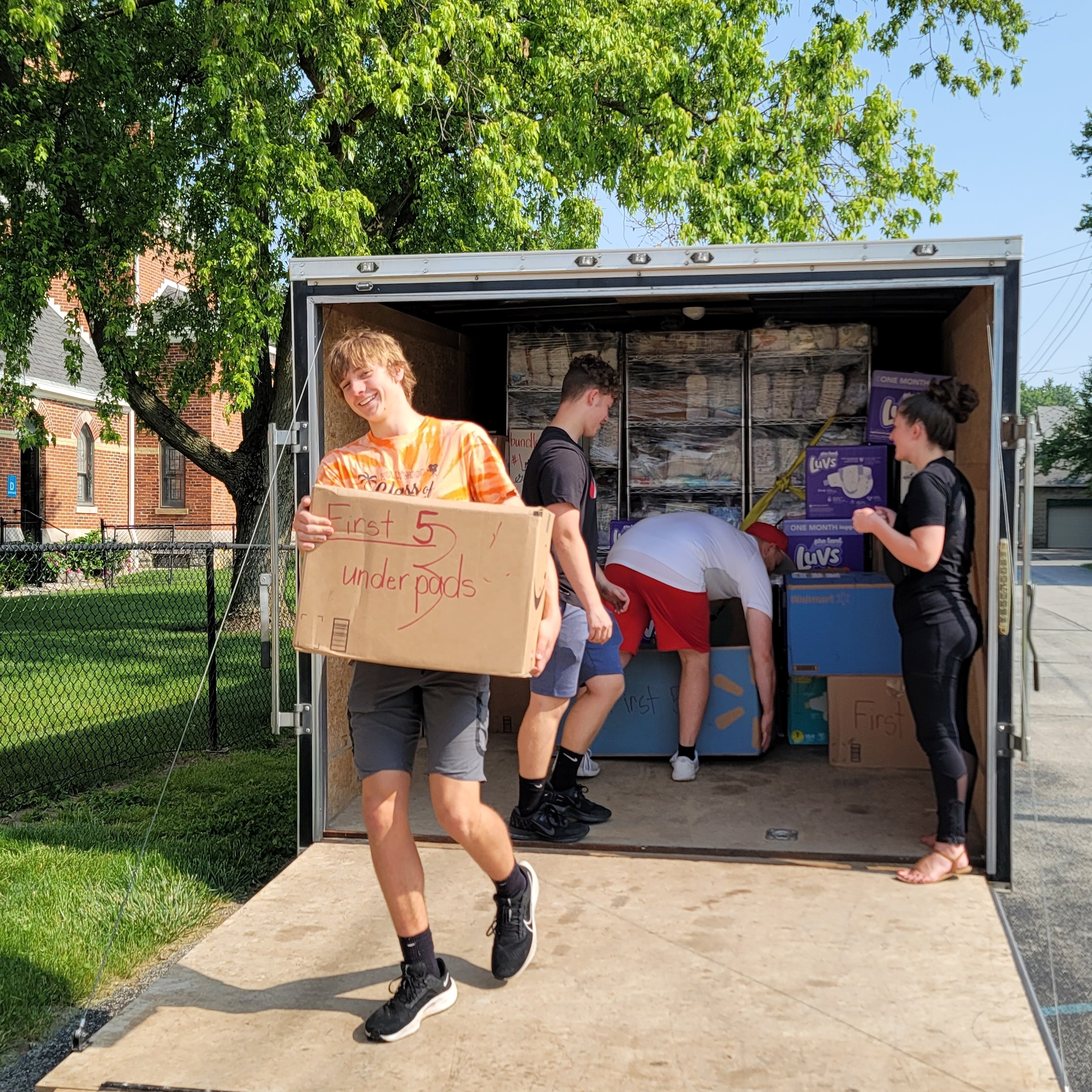 From the Bottom Up, It Takes a Village 1st June 2023 There’s an African proverb that says, “It takes a village to raise a child.” That applies to a community diaper pantry, too. When First5’s From the Bottom Up Diaper Pantry needed a home, Milroy Elementary School (MES) was gracious to offer up space. This worked perfectly with the Milroy Community Food Pantry also on-site. Packs of diapers with wipes, a children’s book, and resources for adults are available to anyone in need at all Rush County food pantries during normal operating hours. With increased enrollment at MES, the space is needed by the school. Packing took place on the last day of classes with RCCF staff & volunteers and 6th grade students working together. They loaded a trailer loaned by the Marlatt Family’s 1st Choice Seeds. RCCF board member, Laura Ash and her husband, Rob, donated short-term storage space. Now where to go? Members of the RCHS football team lend a hand. Enter St. Paul’s United Methodist Church. They generously offered two rooms that were used for storing a few holiday decorations. Add the muscle power of a few players from Coach Sliger’s football team plus staff and volunteers and everything was moved within a couple of hours. This new centralized location will work so well! Our sincere thanks to Milroy Elementary Principal, Lisa Wilson and MES 6th graders, Mindy Vogel, 1st Choice Seeds, Arika Marlatt, Rob and Laura Ash, the staff and board of St. Paul’s United Methodist Church, and RCHS Football Coach Isaac Sliger and his team! We are grateful to our village for making this move go so smoothly. Thanks to Milroy Elementary’s 6th graders for helping out!