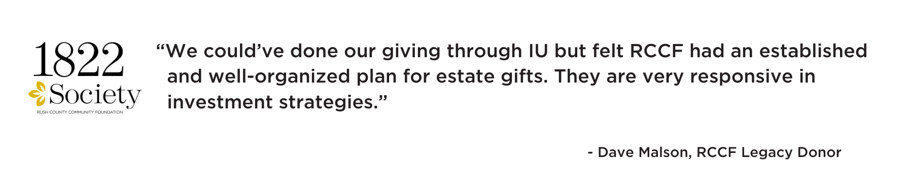 What Will Your Legacy Be? “Being forgotten.” That was Darrell Bills’ greatest fear. To honor her parents and their legacy, Darilyn Bedel created an endowed fund in their memory—a gift that will support Rush County forever. You don’t have to rely on others to carry out your charitable dreams. With a legacy (or planned) gift, you can make a lasting impact beyond your lifetime. You can: Create your own named fund Leave a gift of any amount to an existing fund Designate a percentage of your estate Anyone can be a philanthropist—if you care about a cause, you can make a difference. Do you love the arts, care deeply about education or health, or want to support your favorite local nonprofit? Maybe you’d prefer your gift to go where it’s needed most. Whatever matters to you, we’ll help ensure your wishes are honored. When your legacy gift is received—hopefully many years from now—it will be placed in an endowed fund. That fund will generate earnings. The earnings become grants. The grants strengthen nonprofits. And the nonprofits serve our community. Your original gift stays in the fund, working forever. Don’t be forgotten. Let us help you create a legacy that’s unforgettable. Types of Legacy Gifts BEQUESTS/GIFTS IN YOUR WILL A bequest is the simplest way to make a legacy gift. You can leave a percentage or remainder of your estate or a specified amount to RCCF in your will or trust. Gifts of $10,000 or more can be used to start a new fund. Gifts of less that $10,000 may support one or more existing funds. Bequests allow you to care for your loved ones while still supporting your community forever. Bequests are revocable. Download a .pdf of sample bequest language. Sample Bequest Language Speak with your attorney to help you set up a bequest to RCCF in your estate plan. Here are some examples of basic language to use: Percentage Bequest: If you are considering making a bequest of a percentage of your estate to Rush County Community Foundation, we recommend the following language: I hereby give, devise and bequeath ____ percent (___%) of my total estate, determined as of the date of my death, to Rush County Community Foundation, a nonprofit organization located at 117 North Main Street, Rushville, IN, 46173, Federal Tax ID #35-1835950, for Rush County Community Foundation’s general use and purpose. Residual Bequest I hereby give, devise and bequeath to Rush County Community Foundation, a nonprofit organization located at 117 North Main Street, Rushville, IN, 46173, Federal Tax ID #35-1835950, ALL OR A PERCENTAGE of the rest, residue and remainder of my estate to be used for Rush County Community Foundation’s general use and purpose. Specific Bequest: If you are considering making an outright bequest to Rush County Community Foundation, we recommend the following language: Bequest of a Specific Dollar Amount I hereby give, devise and bequeath _________ and No/100 dollars ($DOLLARS) to Rush County Community Foundation, a nonprofit organization located at 117 North Main Street, Rushville, IN, 46173, Federal Tax ID #35-1835950, for Rush County Community Foundation’s general use and purpose. Bequest of Specific Personal Property I hereby give, devise and bequeath DESCRIPTION OF PROPERTY to Rush County Community Foundation, a nonprofit organization located at 117 North Main Street, Rushville, IN, 46173, Federal Tax ID #35-1835950, for Rush County Community Foundation’s general use and purpose. Bequest of Specific Real Estate I hereby give, devise and bequeath all of the right, title and interest in and to the real estate located at ADDRESS OR DESCRIPTION OF PROPERTY to Rush County Community Foundation, a nonprofit organization located at 117 North Main Street, Rushville, IN, 46173, Federal Tax ID #35-1835950, for Rush County Community Foundation’s general use and purpose. Contingent Bequest If (primary beneficiary) does not survive me, then I hereby give, devise and bequeath to Rush County Community Foundation, a nonprofit organization located at 117 North Main Street, Rushville, IN, 46173, Federal Tax ID #35-1835950, DESCRIPTION OF PROPERTY to be used for Rush County Community Foundation’s general use and purpose. Restricted Bequests If you are considering a bequest but would like to ensure that your bequest will be used for a specific purpose, please let us know. We would be happy to work with you and your attorney to help you identify ways to give and meet your charitable objectives. We will also work with you and your attorney to craft language to accomplish your goals. If you are making a restricted bequest, we recommend that your attorney include the following provision to give Rush County Community Foundation flexibility should it no longer be possible for our Rush County Community Foundation to use your gift as you originally intended: If, in the judgment of the Board of Directors of Rush County Community Foundation, it shall become impossible for Rush County Community Foundation to use this bequest to accomplish the specific purposes of this bequest, Rush County Community Foundation may use the income and principal of this gift for such purpose or purposes as the Board determines is most closely related to the restricted purpose of my bequest. RETIREMENT PLAN ASSETS: IRA, 401(k), 403(b), PENSION As with bequests, you can leave a percentage or specified amount of your retirement plan. Please see your financial advisor for paperwork designating RCCF as a beneficiary. LIFE INSURANCE Designating RCCF as the beneficiary and/or owner of a life insurance policy that has outlasted its original purpose is an excellent way to support our mission. You may have purchased a policy to provide for minor children and they are now financially independent adults. This allows you to make a large gift with little cost. Revocable if RCCF is beneficiary only. Irrevocable if RCCF is both owner and beneficiary. PAYMENT ON DEATH (POD) or TRANSFER ON DEATH (TOD) Upon death, RCCF r