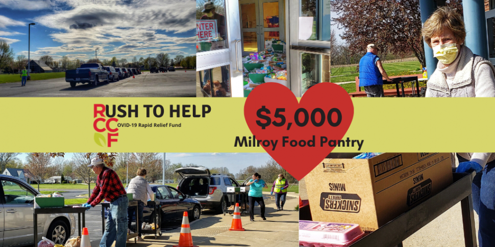 Milroy Food Pantry Receives $5,000 Rapid Relief Grant 22nd April 2020 Your generosity keeps making a BIG difference! The Rush to Help: COVID-19 Rapid Relief Fund has donated $5,000 to the Milroy Food Pantry. On Monday alone, 125 families received pre-packaged food parcels with eggs, produce, canned and baked goods, cereal, peanut butter and jelly and more – in just two hours! This group functions as a well-oiled machine. Volunteers in face masks and gloves packed food, directed traffic, loaded carts, wheeled food to cars, sanitized the carts after each use and started the cycle over until all were cared for. The Milroy Food Pantry is part of the Rush County Community Assistance (RCCA) Food Pantry but operates under a separate budget. Director Jan Long said she learned from the best – Darilyn Bedel and her crew. “It’s all about organization and I’m really obsessive about that anyway! Having excellent volunteers, which Milroy has is what makes it all work,” Jan said. We’re grateful to them for their service and to you for donating! It’s not too late to help.