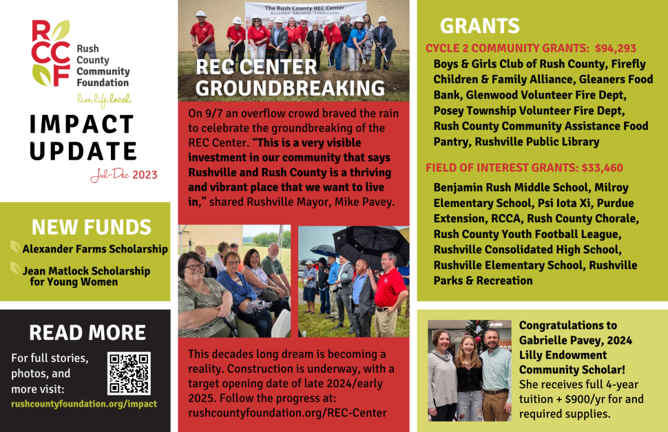 2023 Impact Update: Postcard #2 Download a pdf of the postcard. “The future belongs to those who believe in the beauty of their dreams.” – Eleanor Roosevelt We can be happy today and still want a better tomorrow, right? As someone invested in Rush County’s present and future, you know this is true. With two matching opportunities too good to pass up, there’s never been a better time to make a bigger impact. Or to believe. All gifts made to unrestricted Community Grants Funds are matched 2:1 by Lilly Endowment Inc.’s GIFT VIII initiative. These are the most flexible grant dollars available, supporting everything from public safety to community art. A gift today TRIPLES your impact for tomorrow. The REC Center is taking shape. Construction costs are funded, but its future needs are not. When donations total $225,000 to the Schroeder Fund (started by Wilma Jo Kile to provide for its sustainability), a match of $750,000 will turn this into $1 million! The combined generosity local donors ia making this possible. And of course, you are, too – thank you! Give today to fuel these dreams. GRANTS We’re thrilled to share that your generosity created the largest Community Grants cycle yet with $94,293 in awards this fall! Read more about these grants that connect your generosity to projects and programs supporting those struggling with basic needs, ensuring public safety, and encouraging fitness and social skills development in youth. 2023 CYCLE II: $94,293 $ 3,490: Rushville Public Library will provide free income tax preparation for seniors and low-income individuals and families. $ 5,000: Firefly Children & Family Alliance purchased diapers for From the Bottom Up Diaper Pantry. $15,000: Gleaners Food Bank will provide 120,000 pounds of shelf-stable food and 50,000 pounds of fresh produce to Rush County residents experiencing food insecurity. $ 7,083: Rush County Community Assistance Food Pantry will be able to continue providing milk to those they serve. $28,725: Glenwood Volunteer Fire Department purchased a set of TNT extrication tools to equip the Engine Truck. $24,995: Boys & Girls Club purchased the iWall exergame. 2023 FIELD OF INTEREST FUNDS Rush County Education Fund: $4,443 Benjamin Rush Middle School administrators received $1,470 for their Positive Referrals program. Benjamin Rush Middle School purchased 3 cameras for students working on the yearbook with their $1,200 grant. Milroy Elementary received $1,772 to purchase math manipulatives – physical tools like special blocks, coins, puzzles, etc. Rita Yager Memorial Ag Grant Fund: $1,700 Rushville Parks & Recreation received a $1,200 grant to purchase supplies such as binoculars, field guides, and books. Benjamin Rush Middle School received $500 to provide transportation for all 8th grade students during a Career & Ag Day. cost of transportation. Music for Rush County Fund: $2,425 Rushville Elementary School 3rd and 4th graders learned to play the recorder and received their own instrument because of a $750 grant. Rush County Chorale received a grant of $1,675 to help cover expenses such as fees for guest soloists/instrumentalists and performance venues, sheet music, printing, and publicity. Alex Workman Memorial Fund: $2,823 Rushville Consolidated High School received $225 for Life Skills Class supplies. Milroy Elementary School received $510 for Resource Room & Sensory Room Materials. Rushville Elementary School received $2,088 for Bubble Lamps for classrooms. REC CENTER GROUNDBREAKING Shortly before the REC Center groundbreaking ceremony began on September 7, an uninvited guest, the rain, tried to crash the party. Not a chance. As Rushville Mayor, Mike Pavey, said, “This will be one of the most significant days in our community as people look back.” READ MORE LILLY ENDOWMENT COMMUNITY SCHOLAR Congratulations to Gabrielle Pavey, the 2024 Rush County Lilly Endowment Community Scholarship recipient! Gabby receives full-tuition to the Indiana school of her choice, plus $900/year for books and required supplies. She is a resident of Posey Township and is the daughter of Jason and Jamey Pavey. She plans to major in Political Science and Environmental Studies, with the future goal of becoming an Environmental Lawyer. READ MORE NEW FUNDS For years, Gary Alexander has been watching the impact created by the Courtney Anne Huskins Memorial Scholarship, which his sister, Sarah Huskins, began in memory of her daughter and his niece. To continue honoring his family, including his grandparents, parents, and each of his siblings and their spouses, he started the Alexander Farms Scholarship Fund. This scholarship supports a Rush County resident who will attend an accredited college or university to study a medical-related field. The Jean Matlock Scholarship for Young Women assists female college students with a generous annual scholarship that is renewable for up to four years. The award is based on academic merit, financial need, and community involvement. Jean was a trailblazing, career-oriented woman who worked in management at a time when few women worked outside the home. She lived in many places, but she never forgot her home in Rushville. She even returned after retiring. This scholarship was established by her son, Blair Hull and the Hull Family Foundation. “My mother spoke of discrimination in terms of race and gender and fought against that,” he said. “She was able to break the glass ceiling. I hope other women in Rush County will follow in her footsteps.” For a wonderful and charming look at teenage life in Rushville during the late 1920’s, we highly recommend reading Jean’s senior thesis.