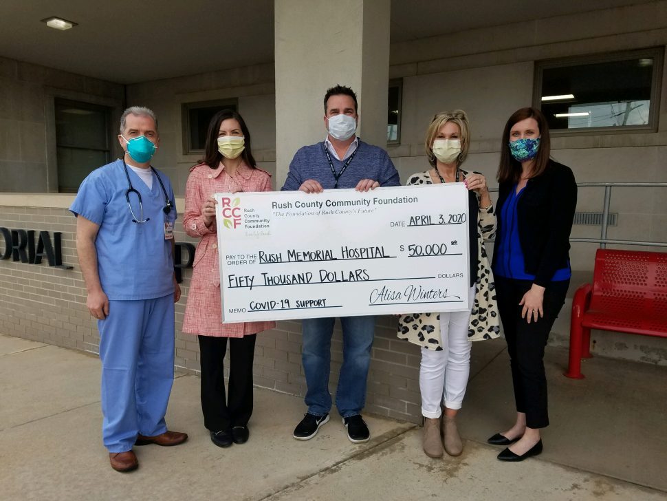 RCCF Grants $50,000 to RMH 3rd April 2020 Pictured left to right: Dr. Daas, Alisa Winters (RCCF Executive Director), Brad Smith (RMH CEO), Carrie Tressler (RMH VP of Nursing), Alle Lilly (RMH Foundation Executive Director) When a world-wide crisis hits close to home, it becomes necessary to take all precautions and make every preparation to ensure our community thrives. The Rush County Community Foundation (RCCF) has granted $50,000 to Rush Memorial Hospital (RMH) in support of efforts to treat and stop the COVID-19 epidemic. The amount is equivalent to the cost of a new respirator but will be used for the most urgent need as determined by RMH. Brad Smith, President and CEO of RMH shared these thoughts. “This generous donation is very timely and will be extremely helpful in taking care of patients with COVID-19. As hospitals across the nation face the challenges of preparing and dealing with the COVID-19 crisis, many hospitals including Rush Memorial have postponed elective surgeries and other non-urgent hospital based types of services. Hospitals are doing this to conserve PPE (personal protective equipment) and to make sure beds are available to deal with the surge of patients that are expected to hit all hospitals. Hospitals, especially small rural hospitals, depend on elective surgeries as well as other hospital services to make them viable. As a result, Rush Memorial Hospital is experiencing a tremendous revenue decrease while our expenses are increasing due to dealing with COVID-19. So to receive such a sizable donation like this allows us to purchase additional equipment necessary to take care of more patients that have COVID-19 during these challenging economic times. I want to thank Alisa Winters and the Rush County Community Foundation Board of Directors for thinking of the needs of the hospital and the community during these unprecedented times. This donation will help save lives. We are RUSHSTRONG and we will get through this together.” Donations from RCCF’s Community Grants funds made this gift possible. These dollars have the greatest flexibility to make an impact. Taking a proactive approach to grantmaking allows RCCF to respond to the ever-changing and most critical needs of the community as they arise. “We are so fortunate to have Rush Memorial Hospital in our community. Amidst this time of uncertainty, we can feel a sense of security with the level of RMH’s staff expertise and their commitment to care. Healthcare providers around the world are facing unprecedented challenges, and our goal is to provide enough funding to reduce some of the burden RMH is facing. This grant will allow our hospital to divert their funds to other critical needs and our community to receive the highest quality of care locally – throughout the COVID crisis and beyond. This grant is made possible by the discretionary funds at RCCF and the many wonderful donors who have entrusted us to grant funds to the greatest community needs. To support RCCF’s Community Grants funds or the Rush to Help: COVID-19 Rapid Relief Fund, you can donate online, or you may also mail a check to: RCCF, 117 N. Main Street, Rushville, IN 46173. Together, we can enhance life for all in Rush County for today and tomorrow.