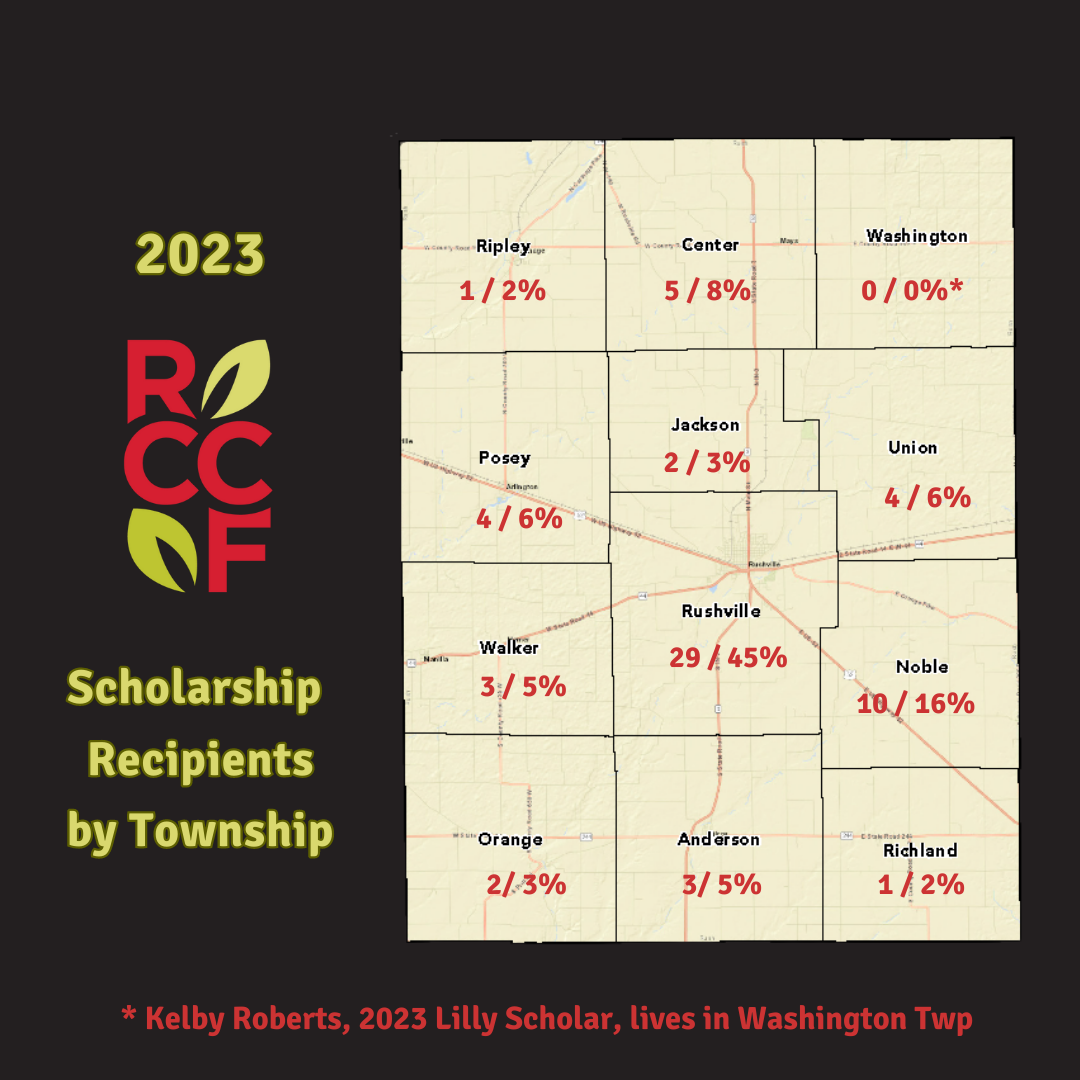Scholarship Season By the Numbers 9th May 2023 The month of May might mean racecars and checkered flags for some. But it means scholarship season for us! As always, our volunteer committee has been busy making tough decisions. (Wondering how that process works? Check out this piece on the lifecycle of a scholarship.) 110 awards from 68 funds totaling $237,734.76 will be presented next week to 65 local students. That’s an average of $3,599.23 per recipient. Thank you to all our donors and fund founders for making this support possible! Did you know that some donors choose to make an additional donation to round out the scholarships that their funds award? We are fortunate to have so many generous people in our community! Follow us on Facebook, Instagram, and/or Twitter to learn more about the recipients and see their smiling faces in the coming weeks. In the meantime we’ve put together some interesting stats about them for you. 2023 Scholarship Recipients by the Numbers: Gender: Female: 48 / 74% Male: 17 / 26% Student Type: Graduating High School Seniors: 31 / 48% College Undergrads: 31 / 48% Graduate Students 3 / 5% Township: Anderson: 3 / 5% Center: 5 / 8% Jackson: 2 / 3% Noble: 10 / 16% Orange: 2 / 3% Posey: 4 / 6% Richland: 1 / 2% Ripley: 1 / 2% Rushville 29 / 45% Union: 4 / 6% Walker: 3 / 5% Washington: 0 / 0%* * Don’t forget, Kelby Roberts, 2023 Lilly Endowment Community Scholar, lives in Washington Township.